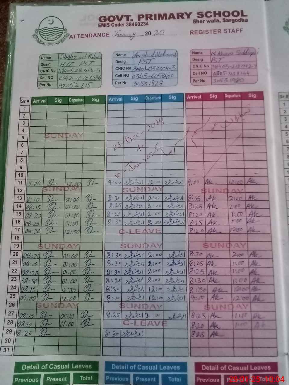 | CNIC | Full Name | Designation | R/C | Absence during last cal. month |