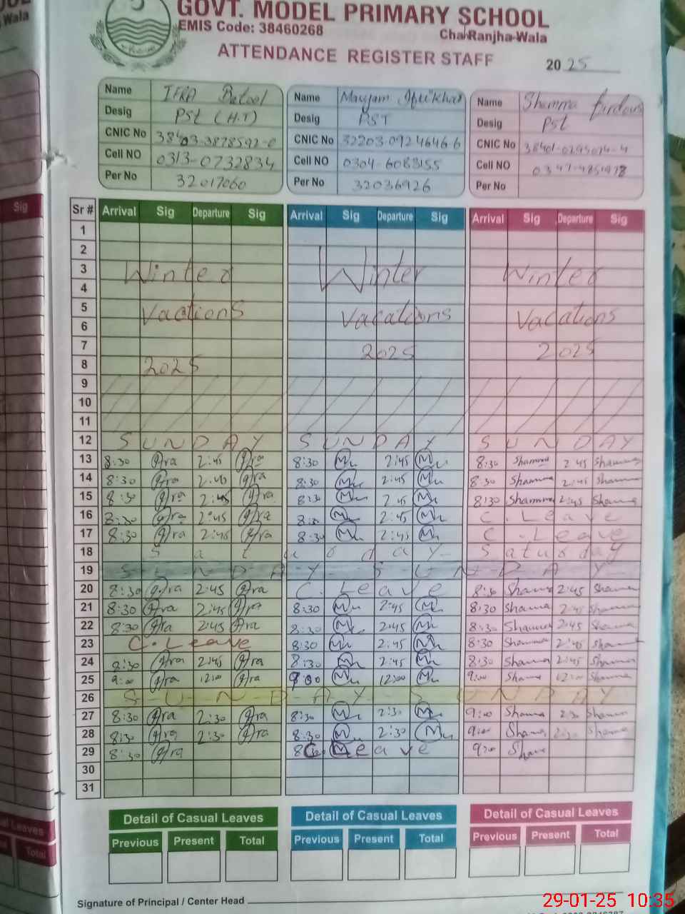 | CNIC | Full Name | Designation | R/C | Absence During Last Calender Month |