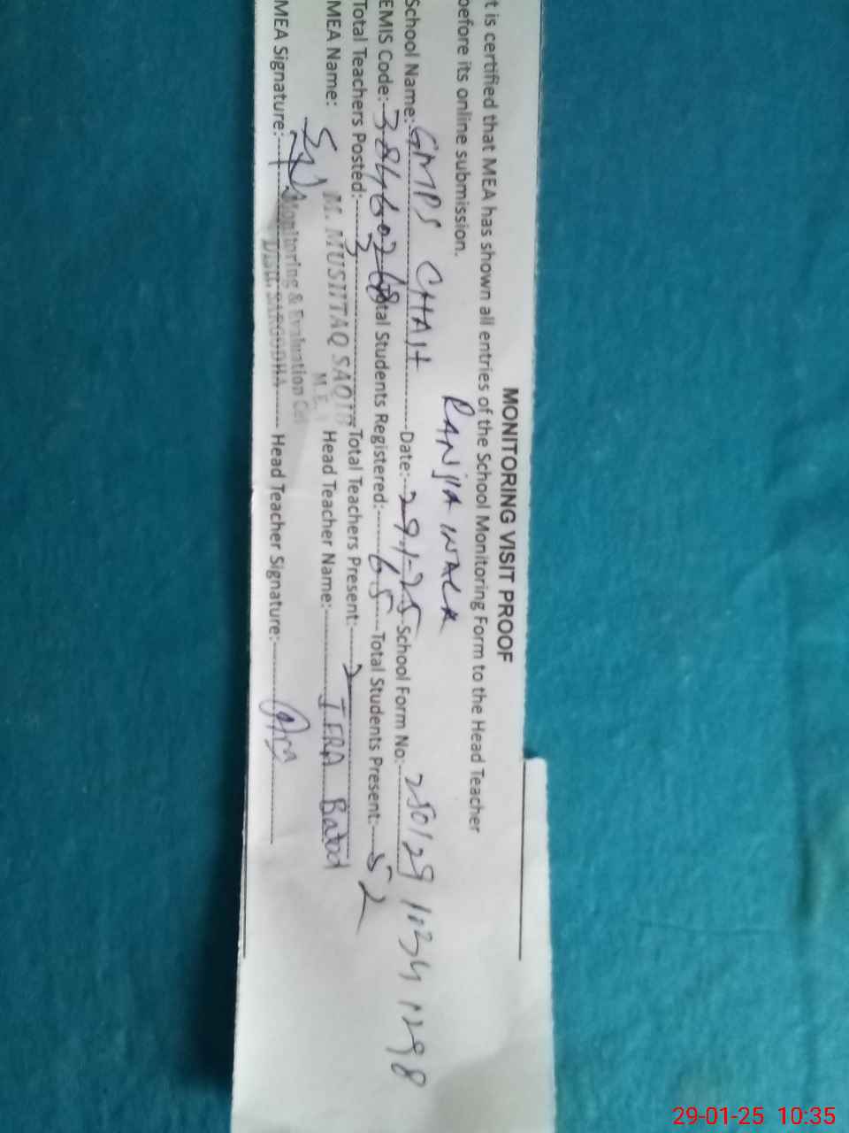 | Attendance Register | Head Teacher | MEA with School | Visit Proof |