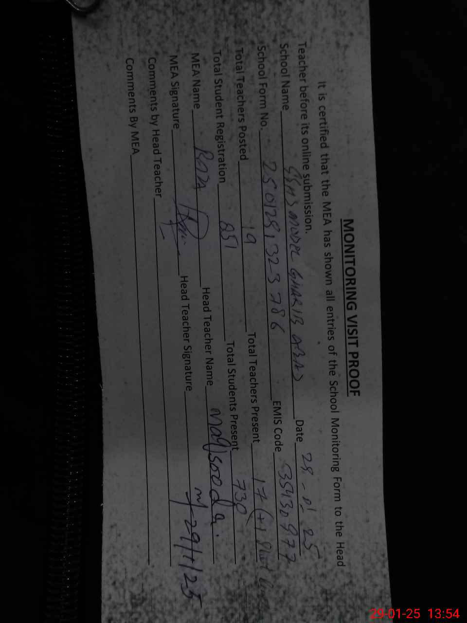 | Attendance Register | Head Teacher | MEA with School | Visit Proof |