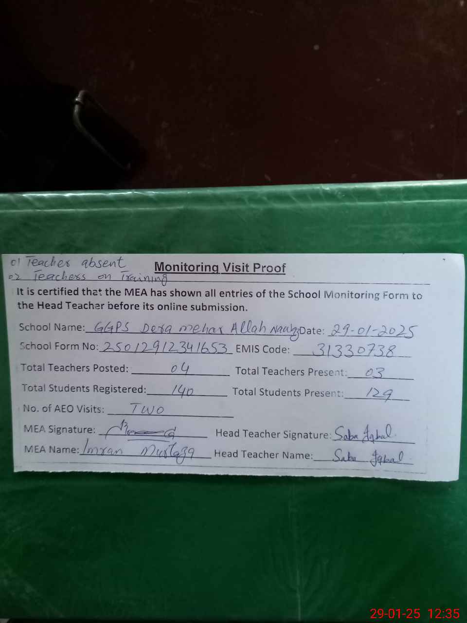 | Attendance Register | Head Teacher | MEA with School | Visit Proof |