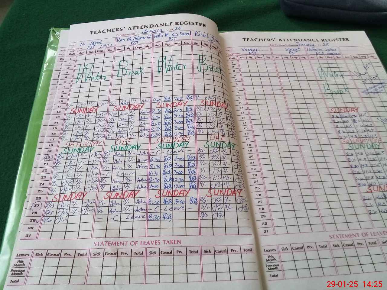 | Leave | Duty | Absent | Maternity | Medical | Ex- Pak |
