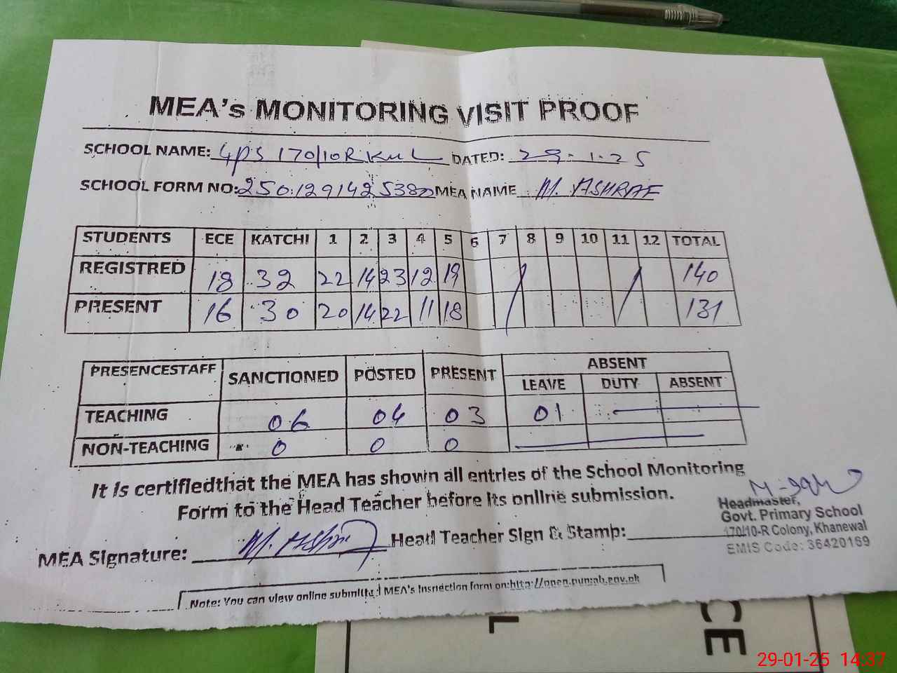 | Attendance Register | Head Teacher | MEA with School | Visit Proof |