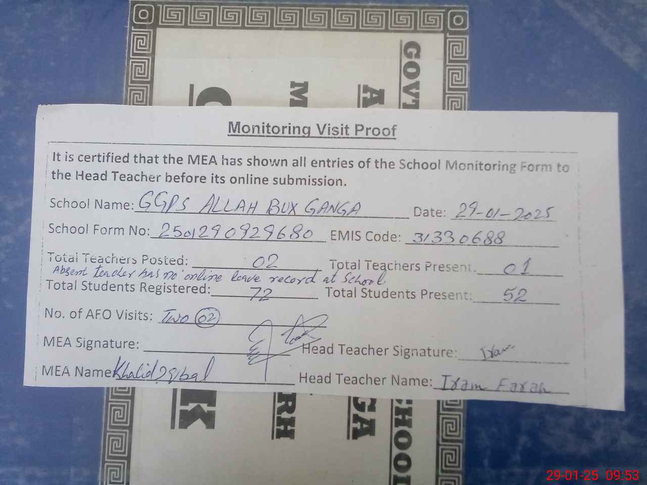 | EMIS Code: 31330688 | Name of School: GGPS ALLAH BUX GANGA | |||
