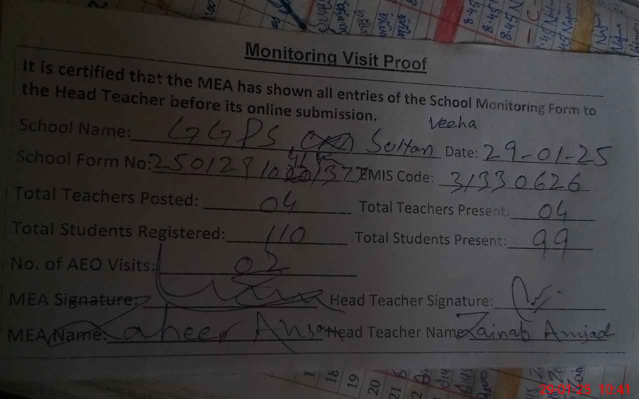 | Monitoring Date: 29-01-2025 | Start Time: 29-01-2025 10:35 AM | End Time: 29-01-2025 10:43 AM | Name of MEA: Za**** Ah**** | |