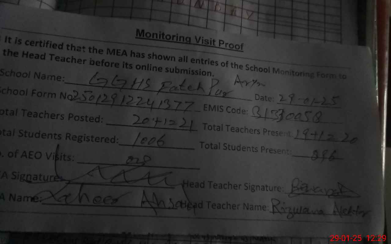 | EMIS Code: 31330058 | Name of School: GGHS FATEH PUR ARAIN | |||