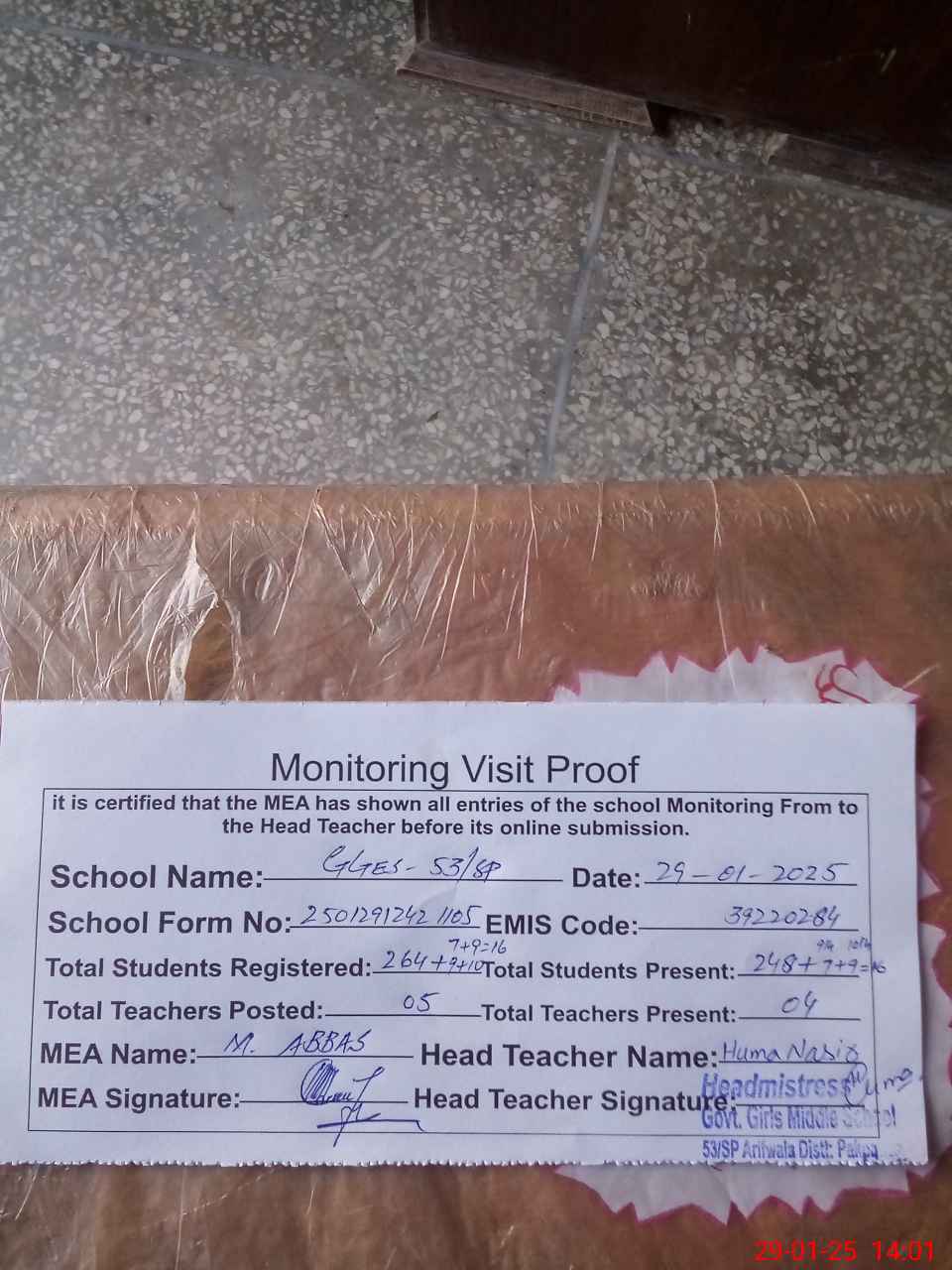 | Attendance Register | Head Teacher | MEA with School | Visit Proof |