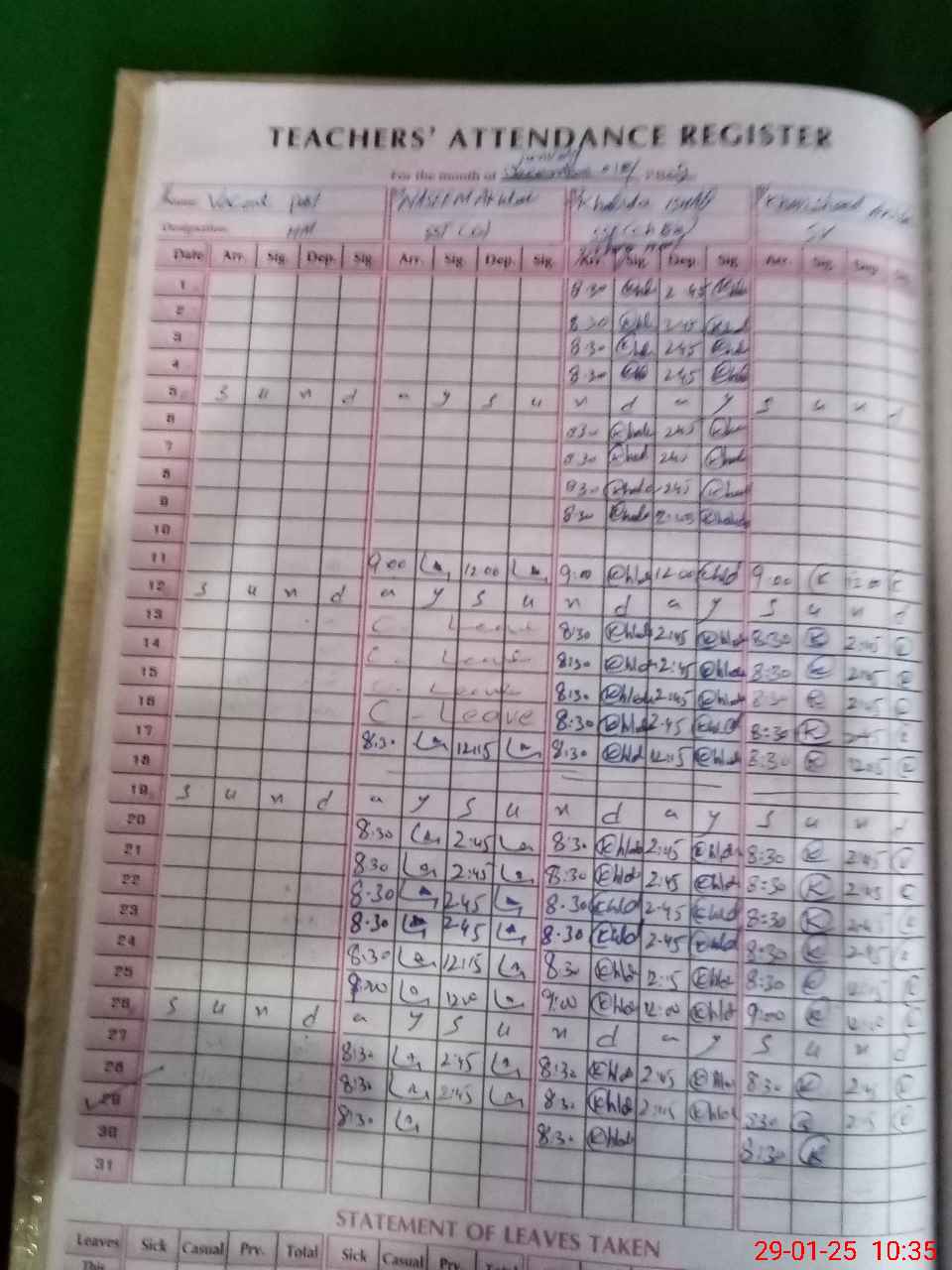 | CNIC | Full Name | Designation | R/C | Absence During Last Calender Month |