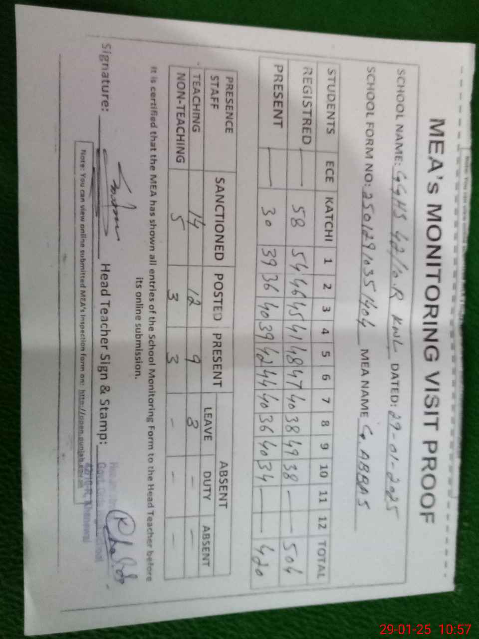 | Attendance Register | Head Teacher | MEA with School | Visit Proof |