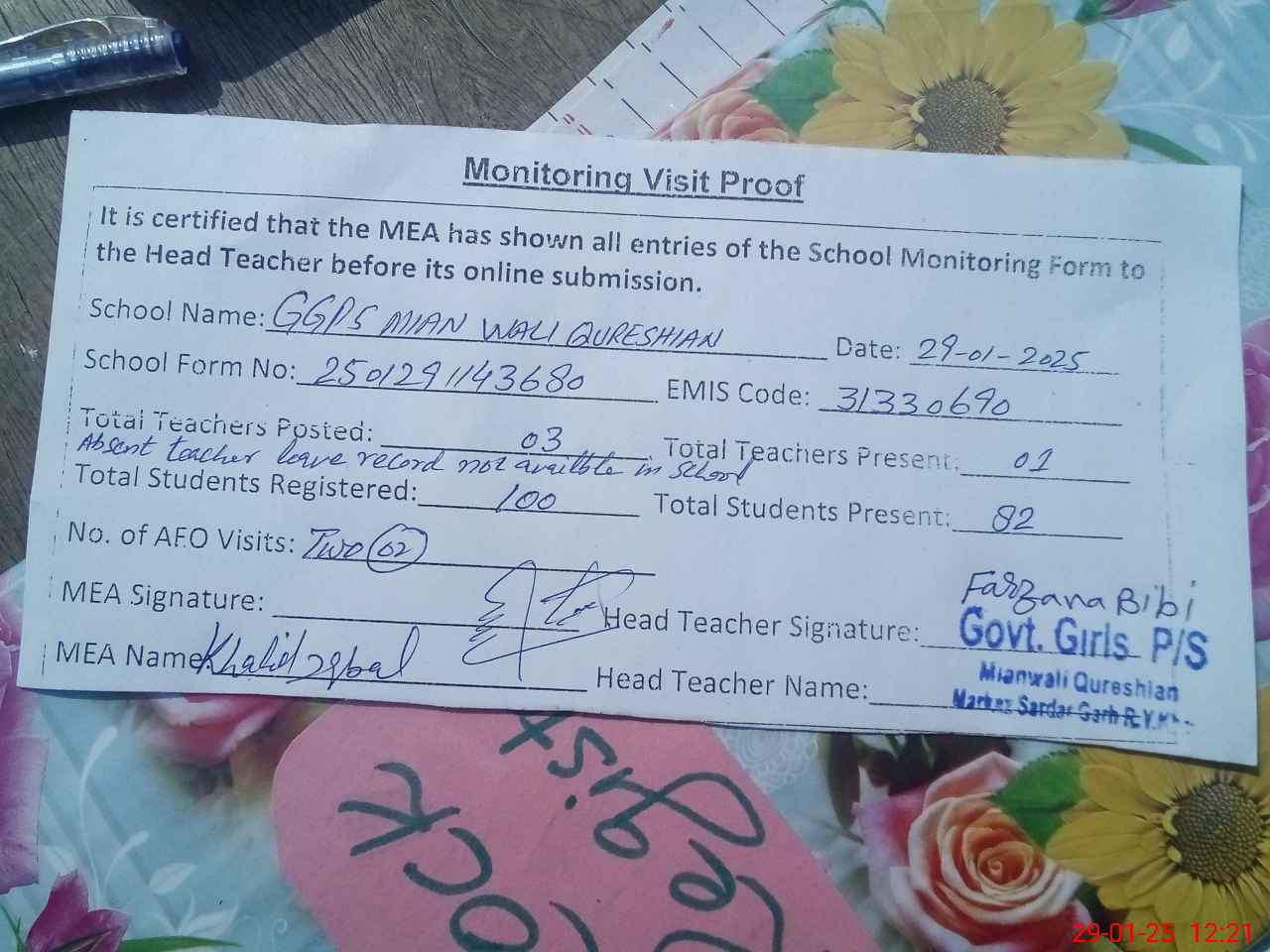 | Attendance Register | Head Teacher | MEA with School | Visit Proof |
