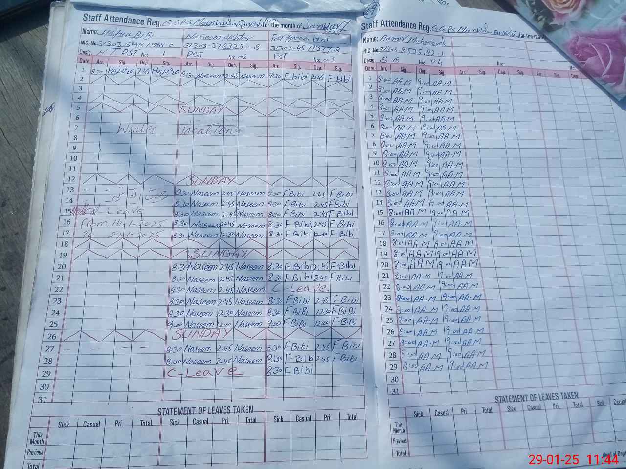 | CNIC | Full Name | Designation | R/C | Absence During Last Calender Month |