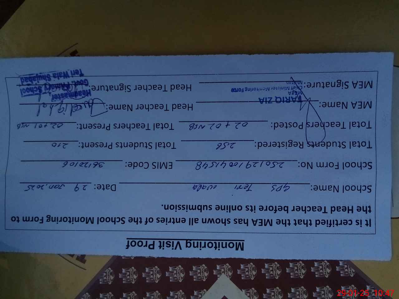 | Attendance Register | Head Teacher | MEA with School | Visit Proof |