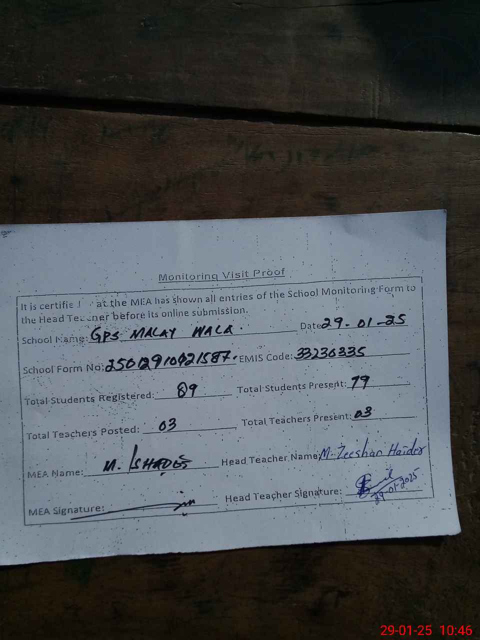 | Attendance Register | Head Teacher | MEA with School | Visit Proof |
