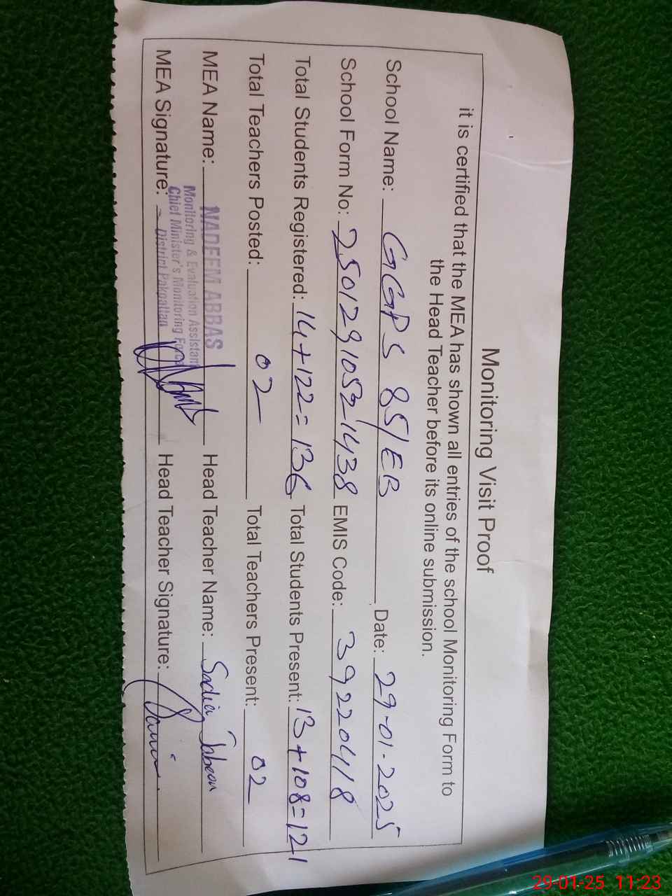 | EMIS Code: 39220418 | Name of School: GGPS 85 EB POST OFFICE QABOOLA | |||