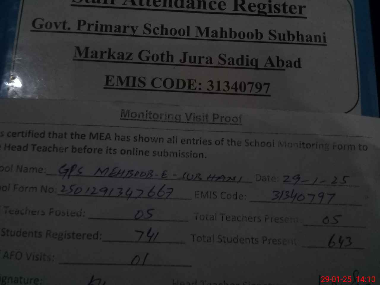 | EMIS Code: 31340797 | Name of School: GPS MAHBOOB SUBHANI | |||