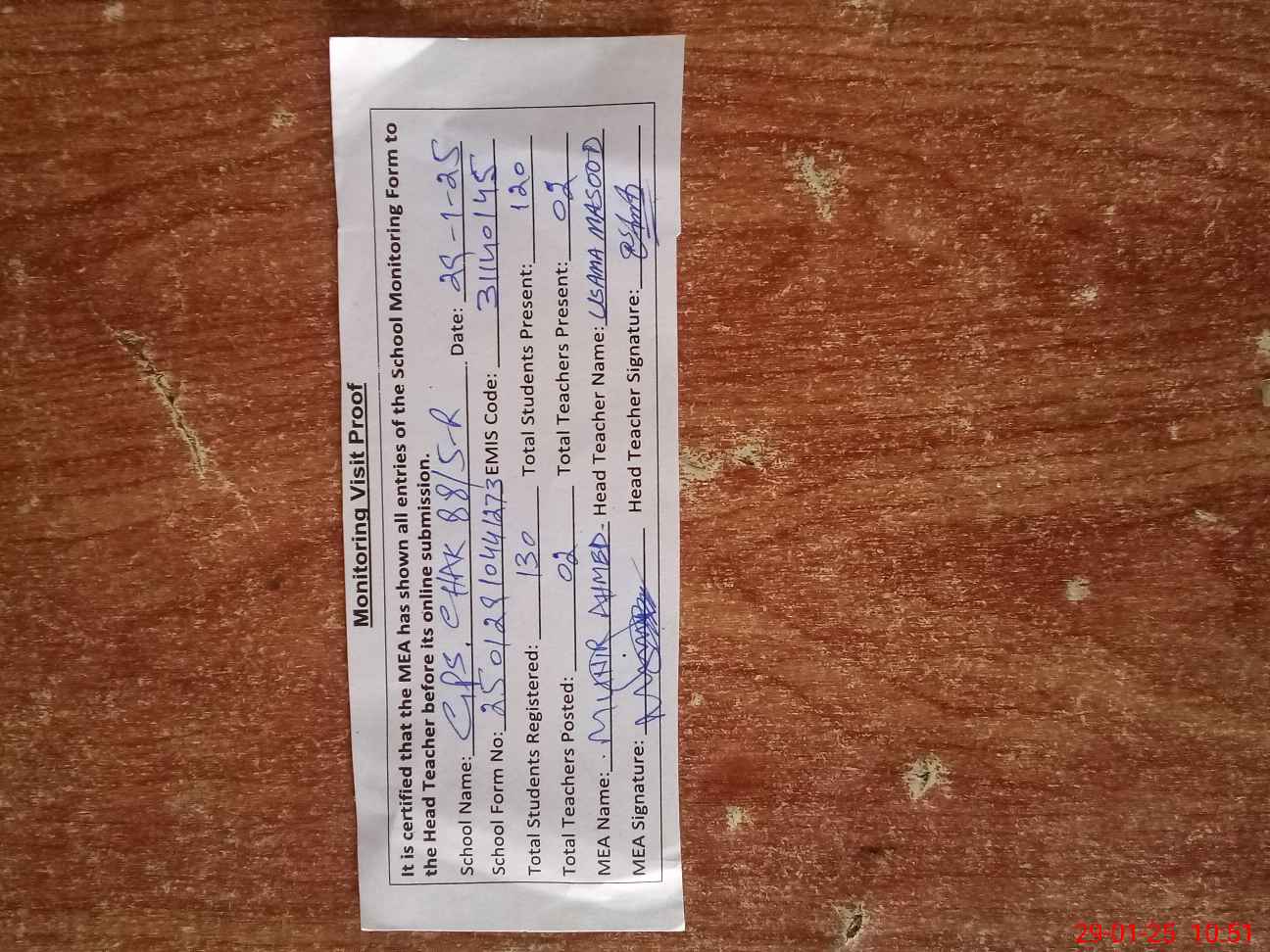 | Attendance Register | Head Teacher | MEA with School | Visit Proof |