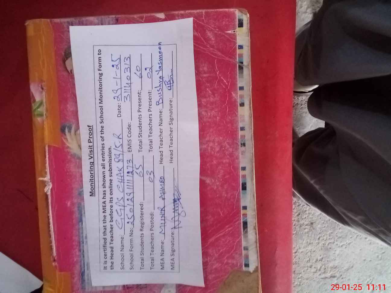 | Attendance Register | Head Teacher | MEA with School | Visit Proof |