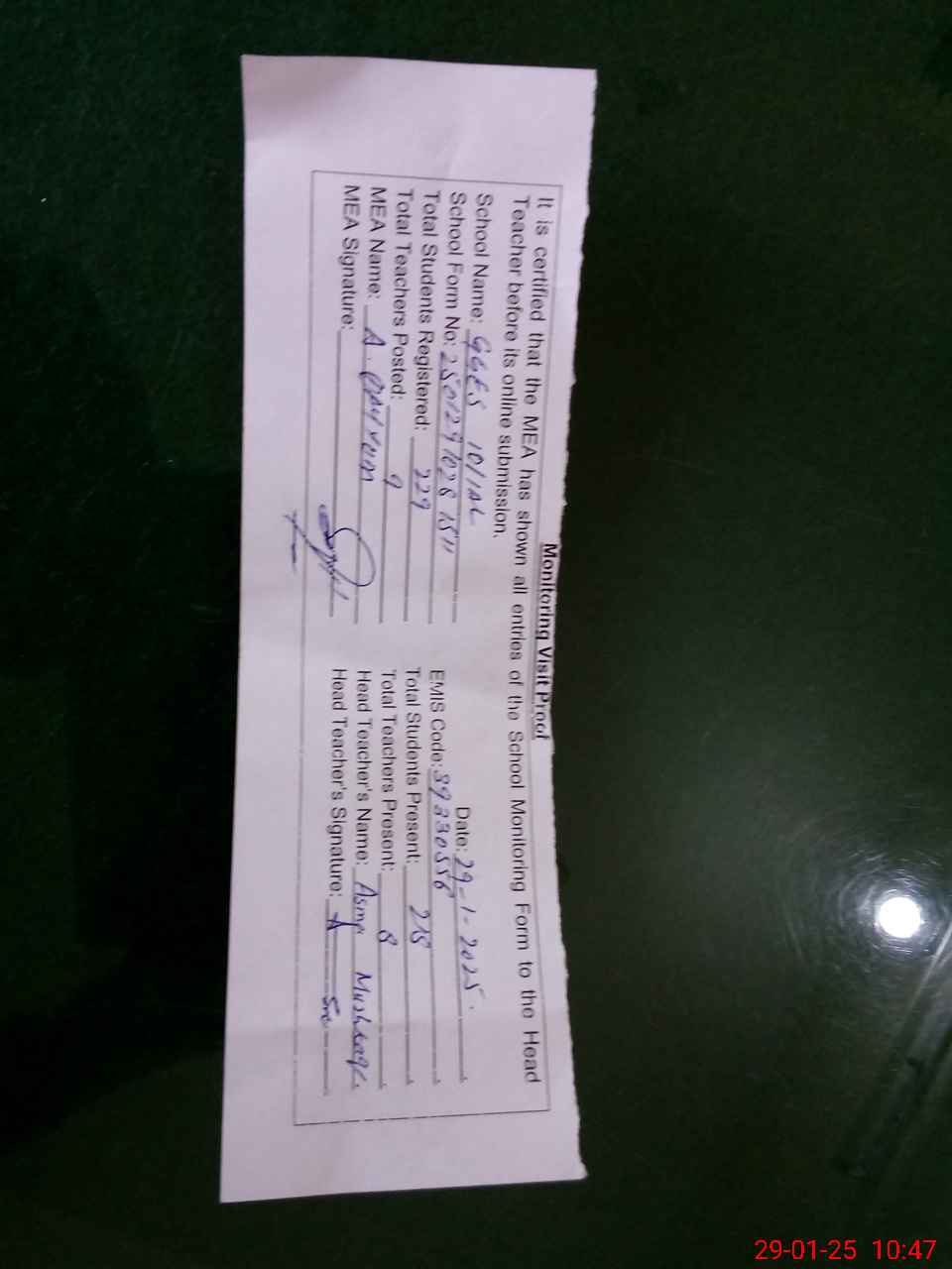 | Attendance Register | Head Teacher | MEA with School | Visit Proof |