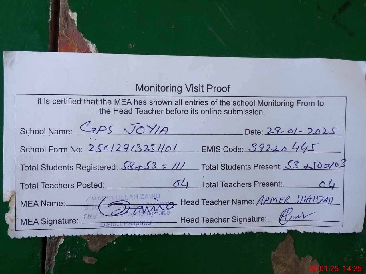 | Attendance Register | Head Teacher | MEA with School | Visit Proof |