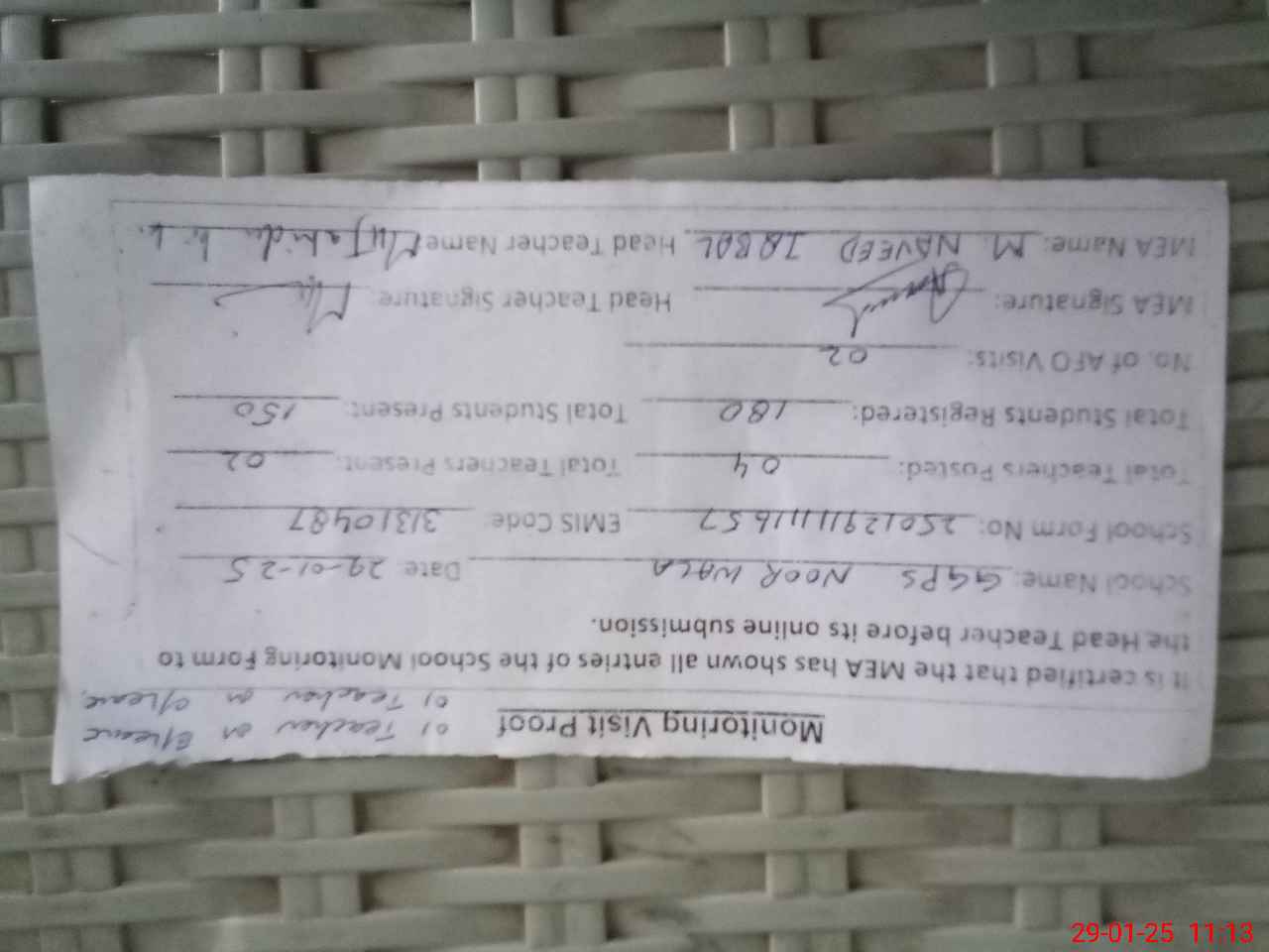 | Attendance Register | Head Teacher | MEA with School | Visit Proof |
