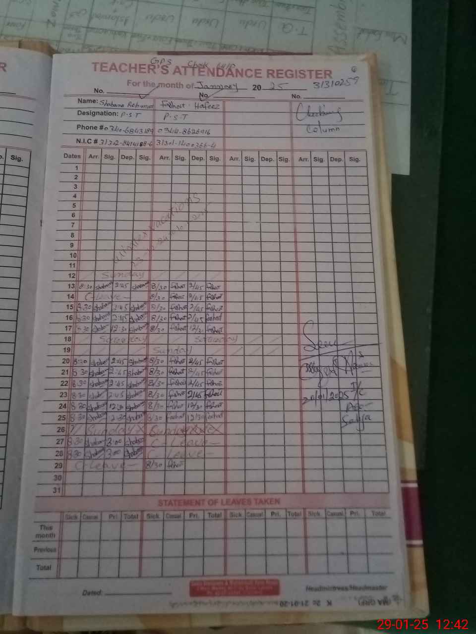 | CNIC | Full Name | Designation | R/C | Absence During Last Calender Month |