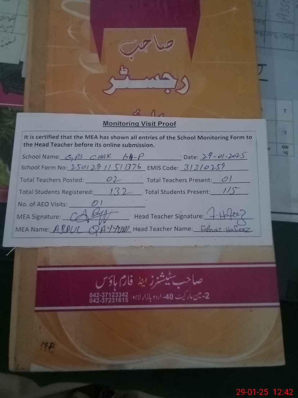| Attendance Register | Head Teacher | MEA with School | Visit Proof |