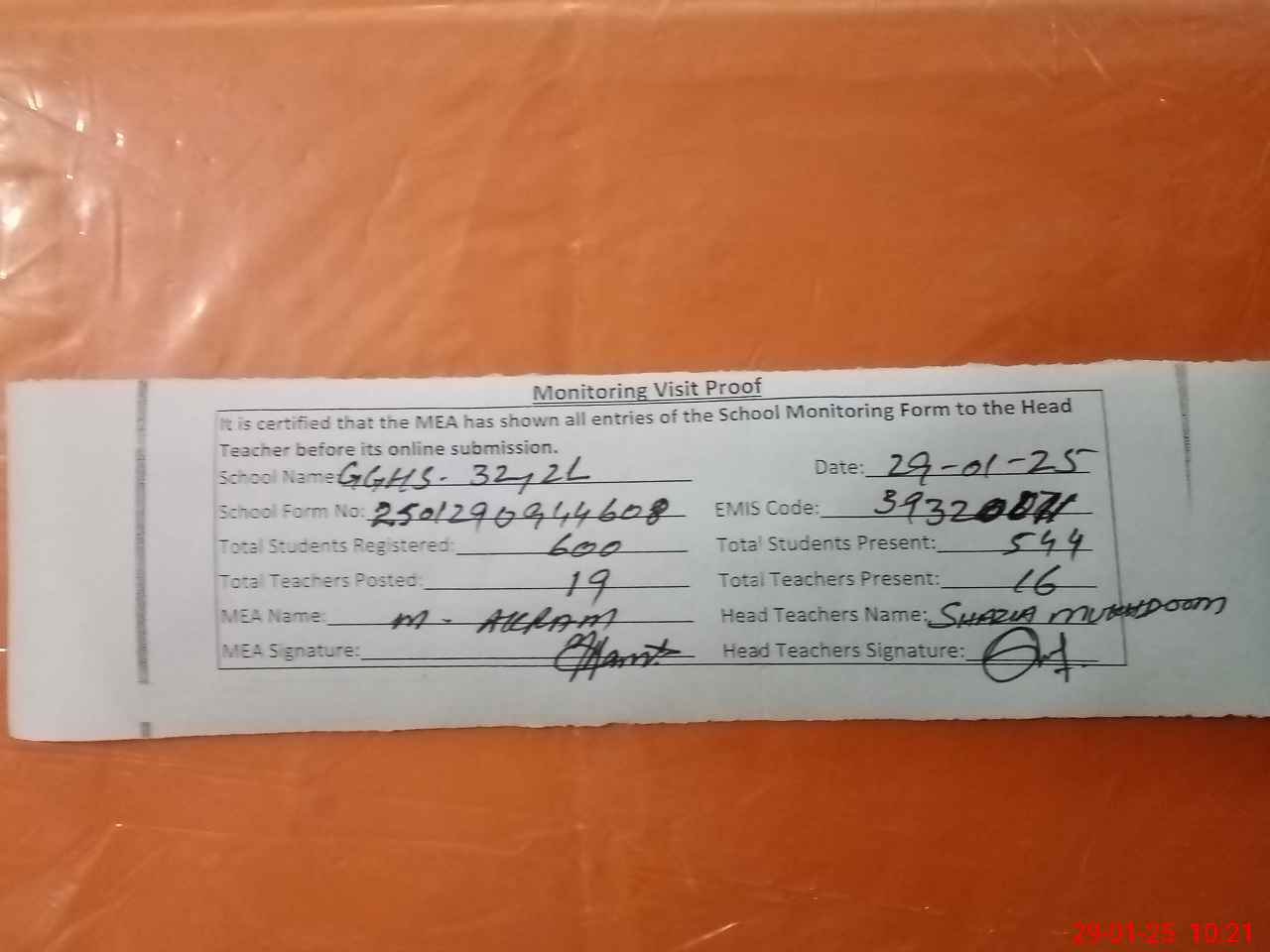| Attendance Register | Head Teacher | MEA with School | Visit Proof |