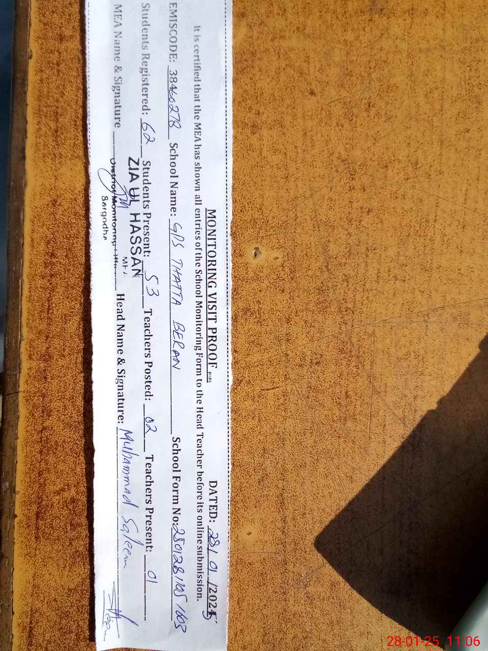 | Attendance Register | Head Teacher | MEA with School | Visit Proof |