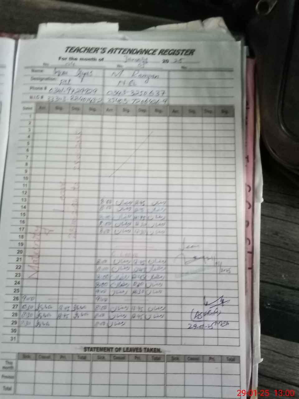 | CNIC | Full Name | Designation | R/C | Absence During Last Calender Month |