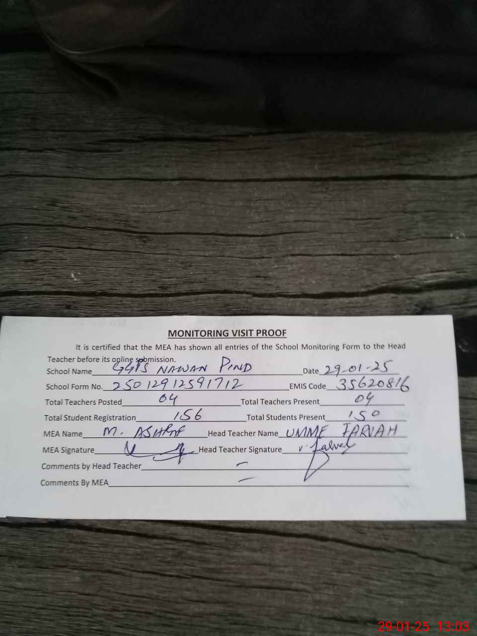 | Attendance Register | Head Teacher | MEA with School | Visit Proof |