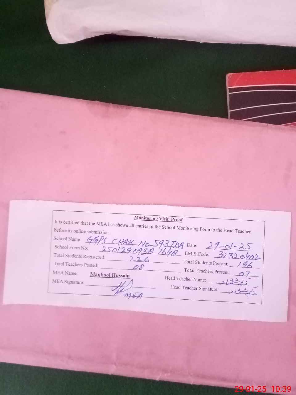 | Attendance Register | Head Teacher | MEA with School | Visit Proof |