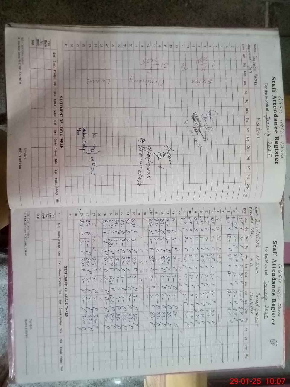| CNIC | Full Name | Designation | R/C | Absence During Last Calender Month |