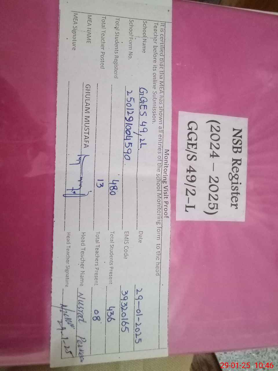 | Certified that this School was Inspected by the Undersigned MEA/DMO Today and the Information Stated Above is as Per Record. | |||||