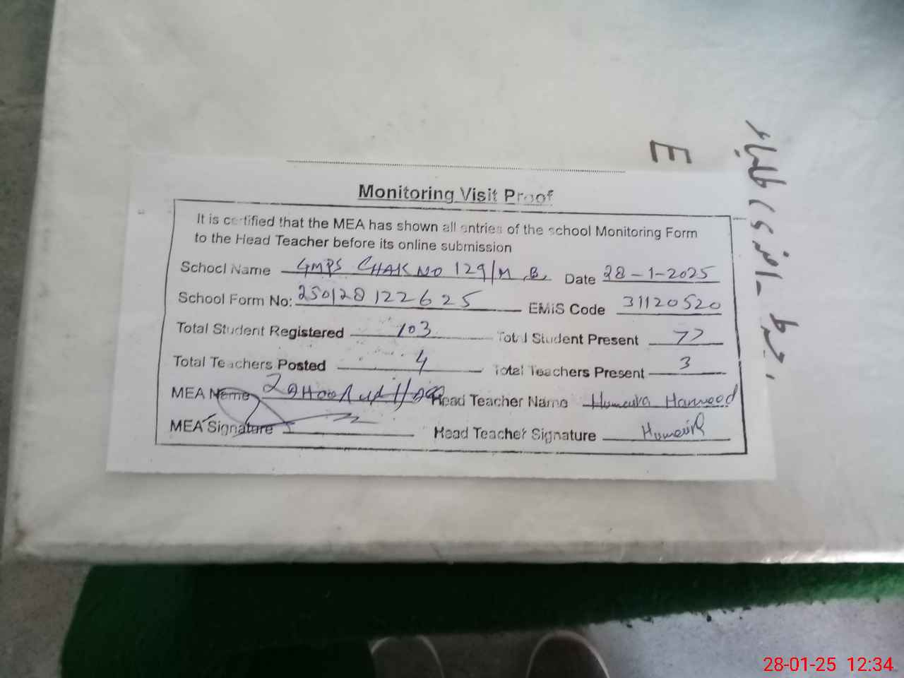 | Attendance Register | Head Teacher | MEA with School | Visit Proof |