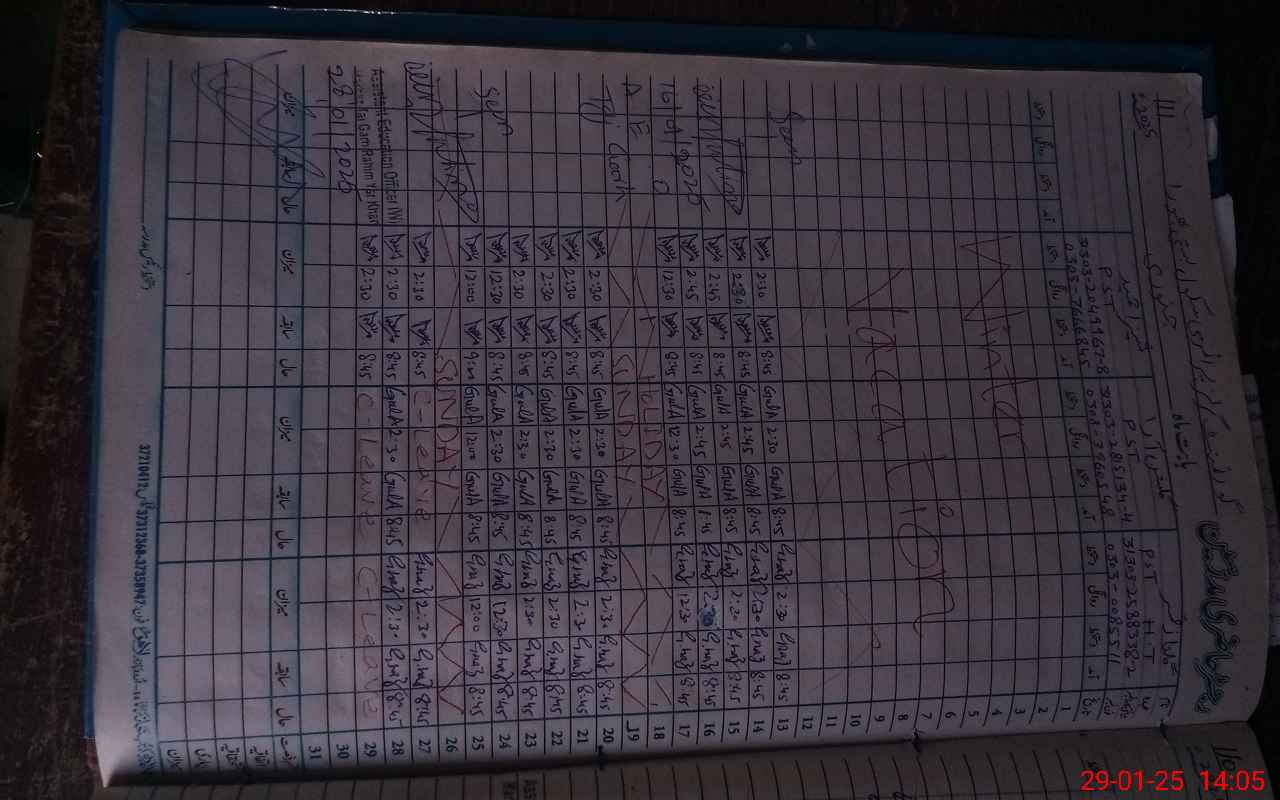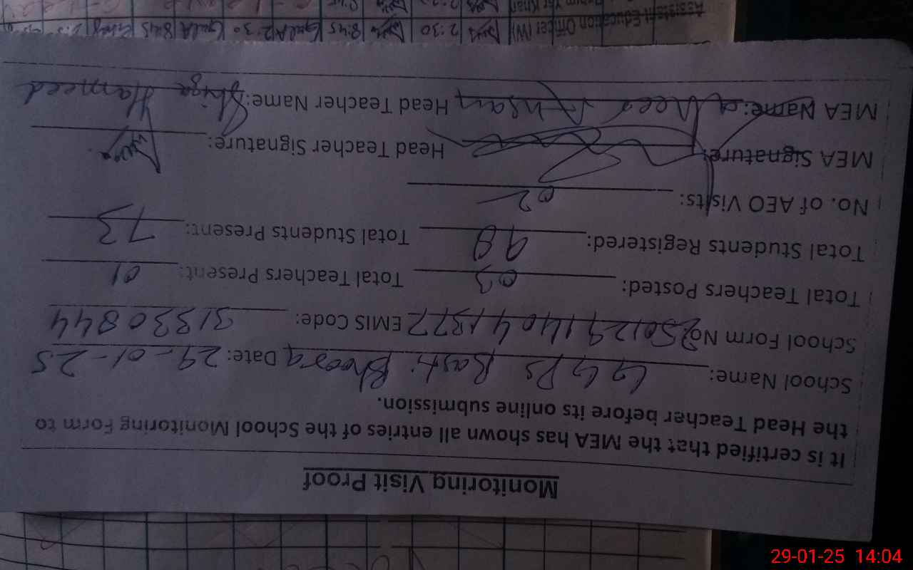 | Total no. of Classrooms: 2 No. of Classrooms Used for Teaching: 2 No. of Classrooms Storing Old Furniture, FTBs, etc: 0Comments if Any: Sir teachers and students attendence on sis not carried out Tab not available 02 Teachers are absented but showing them on leave named Gulnaz Qamar and Gulshan Ara |