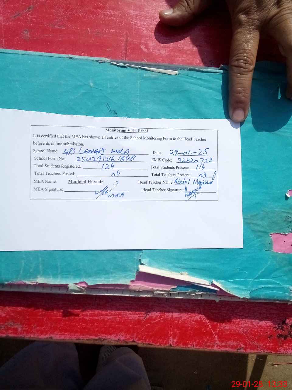 | Attendance Register | Head Teacher | MEA with School | Visit Proof |