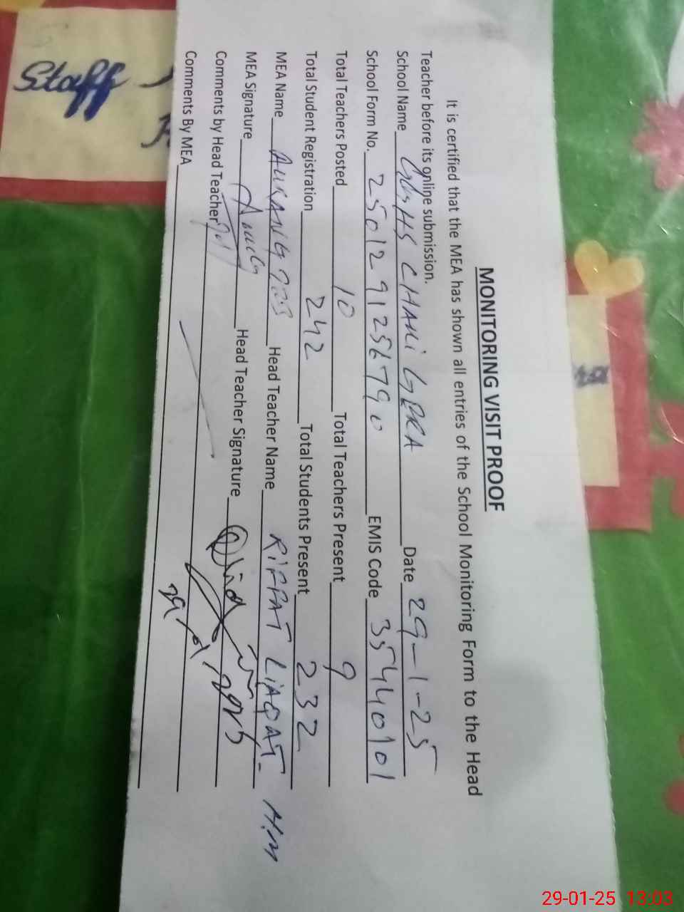 | Attendance Register | Head Teacher | MEA with School | Visit Proof |