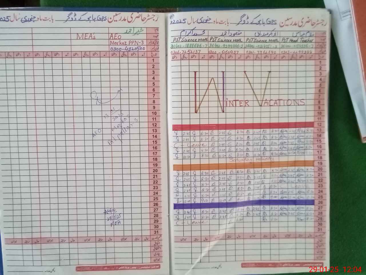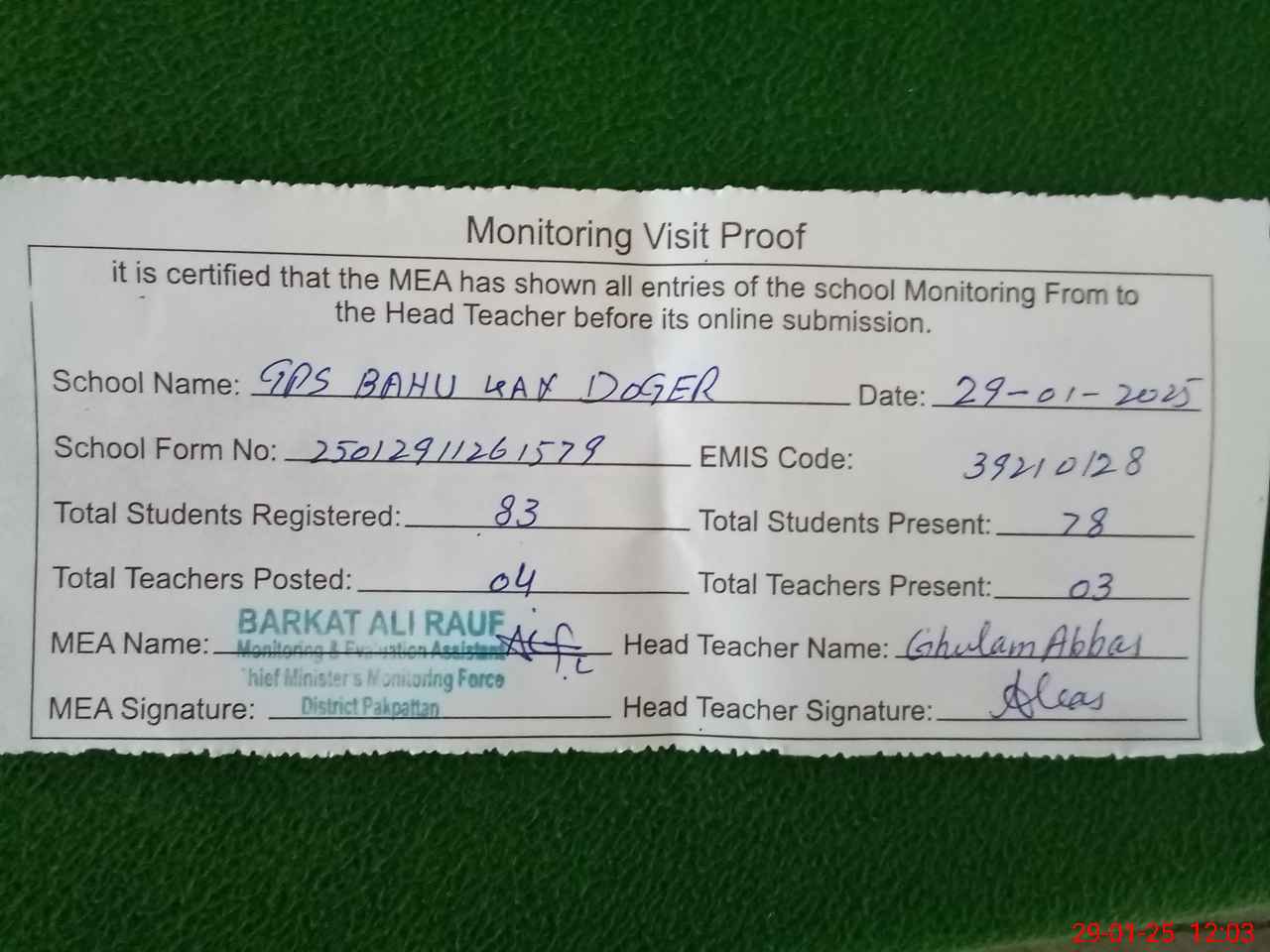 | Attendance Register | Head Teacher | MEA with School | Visit Proof |