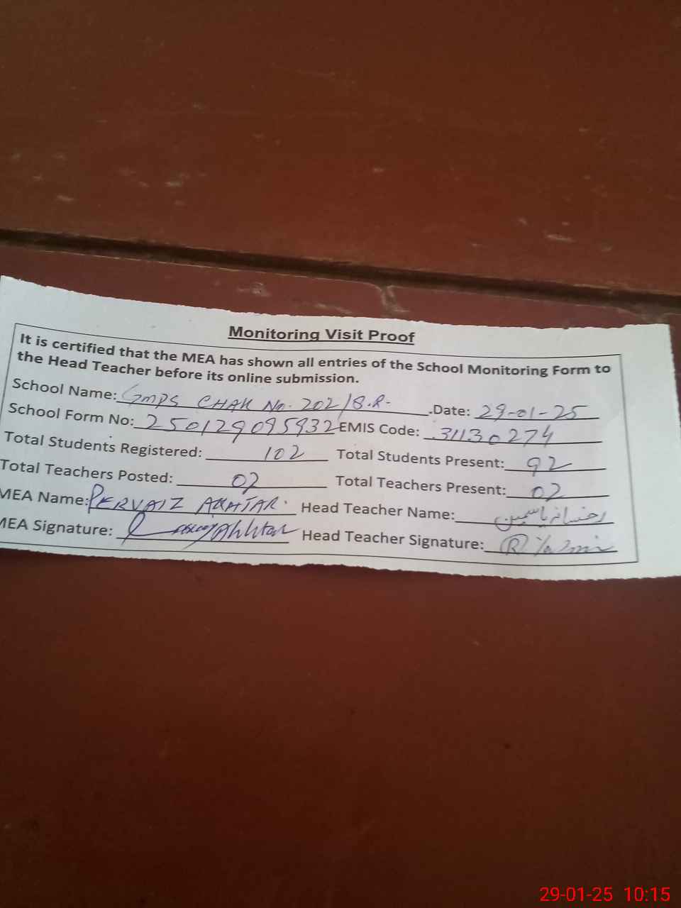 | Attendance Register | Head Teacher | MEA with School | Visit Proof |