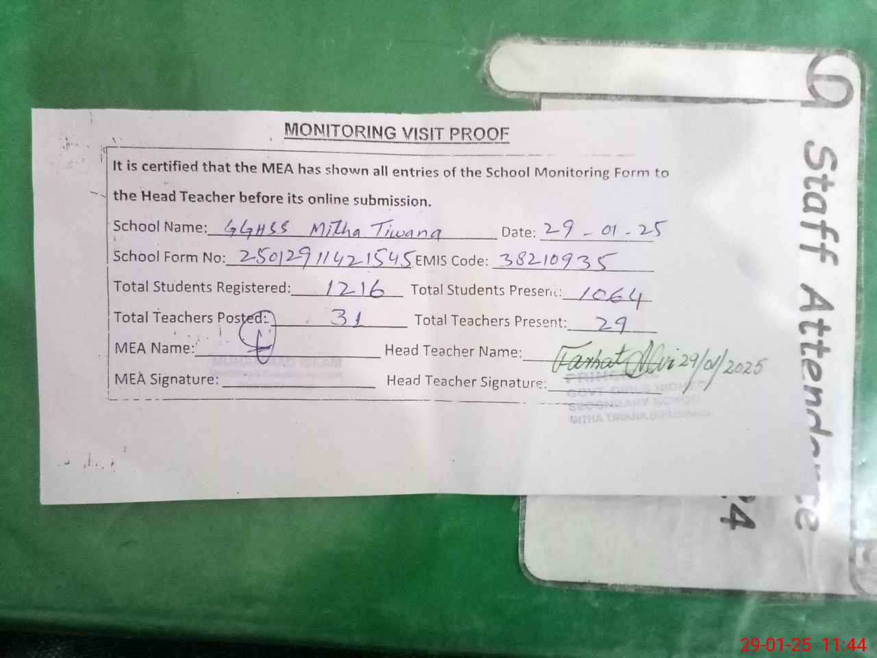 | Attendance Register | Head Teacher | MEA with School | Visit Proof |