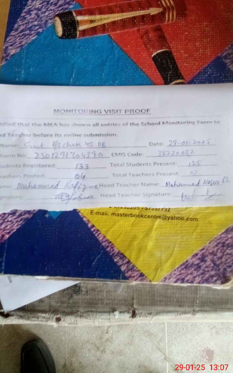 | EMIS Code: 38220082 | Name of School: GPS CHAK NO. 45/DB | |||