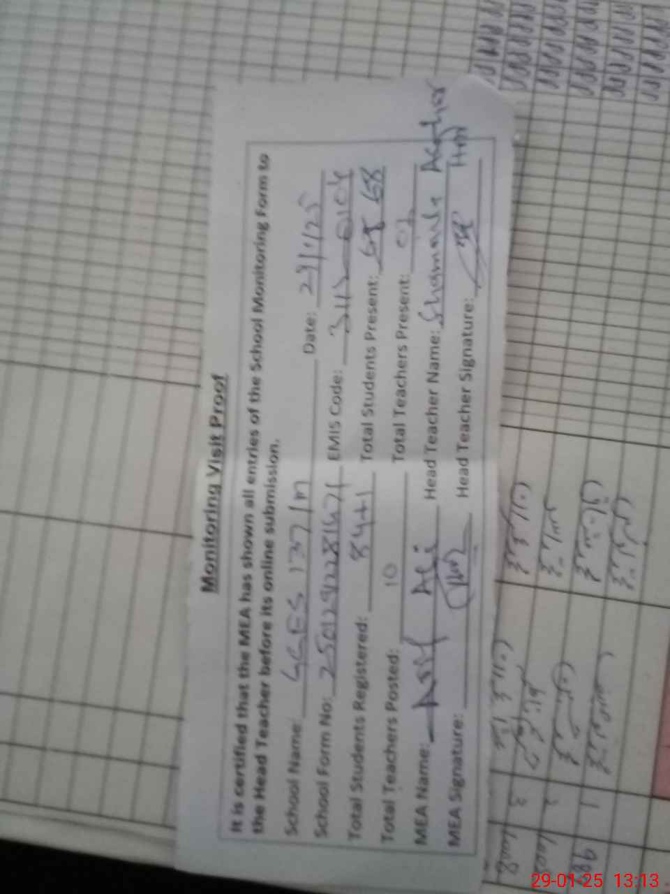 | Attendance Register | Head Teacher | MEA with School | Visit Proof |