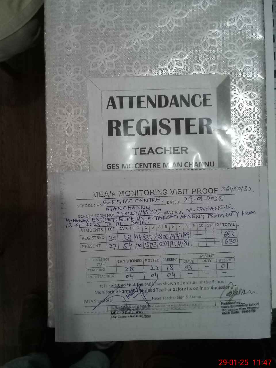 | Attendance Register | Head Teacher | MEA with School | Visit Proof |