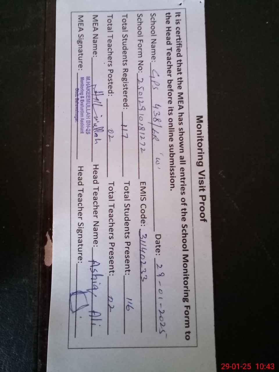 | Attendance Register | Head Teacher | MEA with School | Visit Proof |