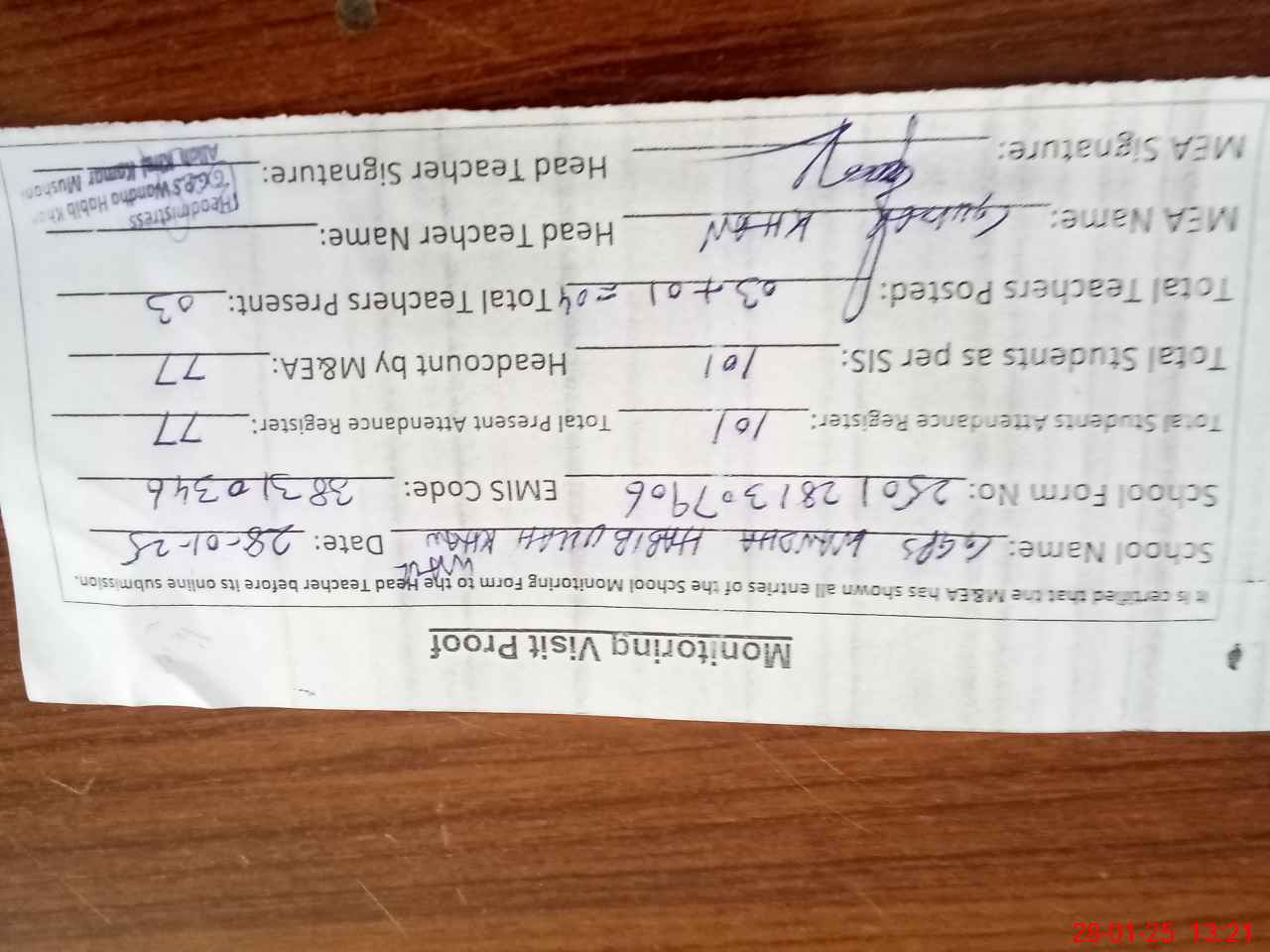 | Attendance Register | Head Teacher | MEA with School | Visit Proof |