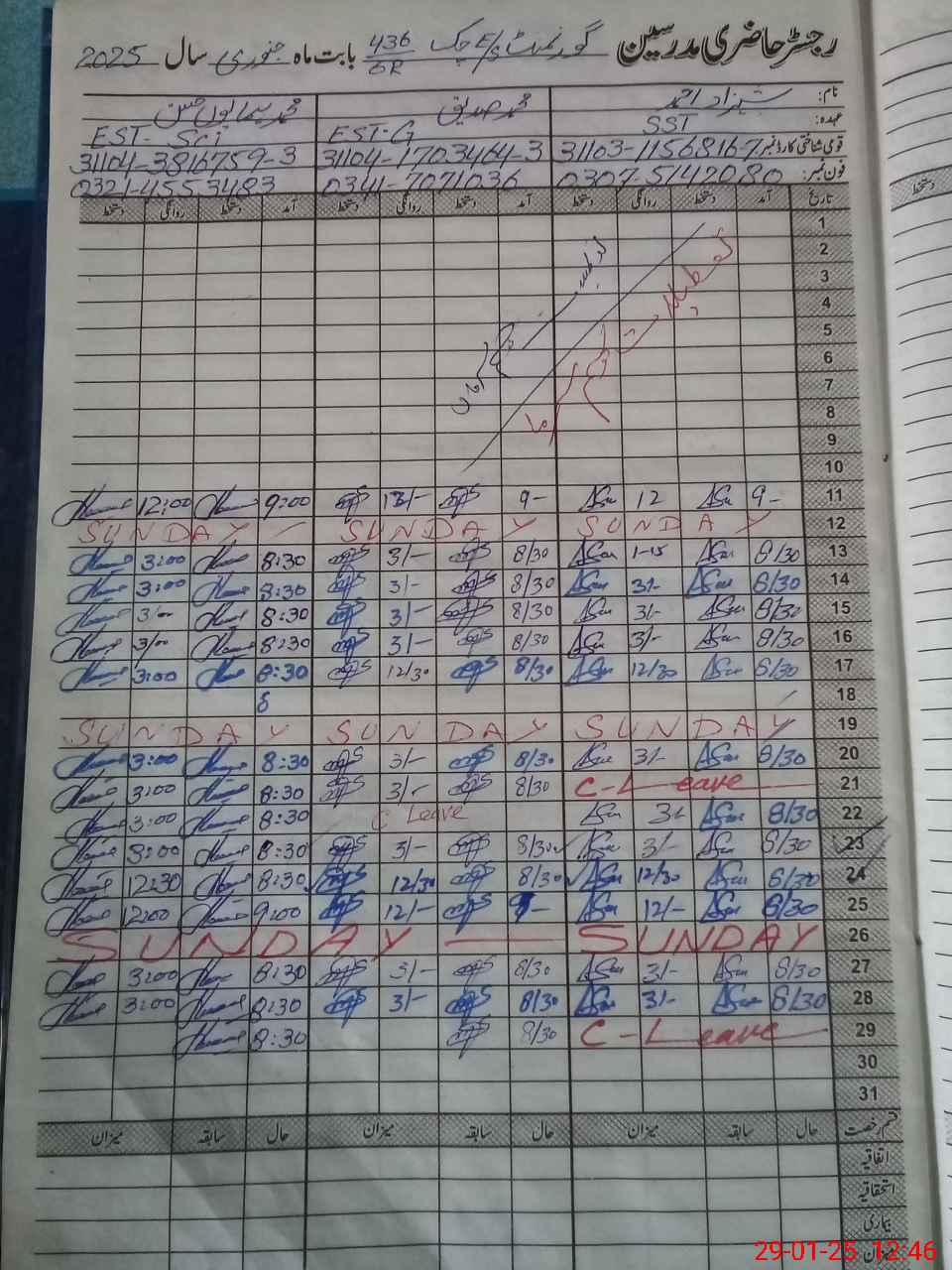| CNIC | Full Name | Designation | R/C | Absence during last cal. month |