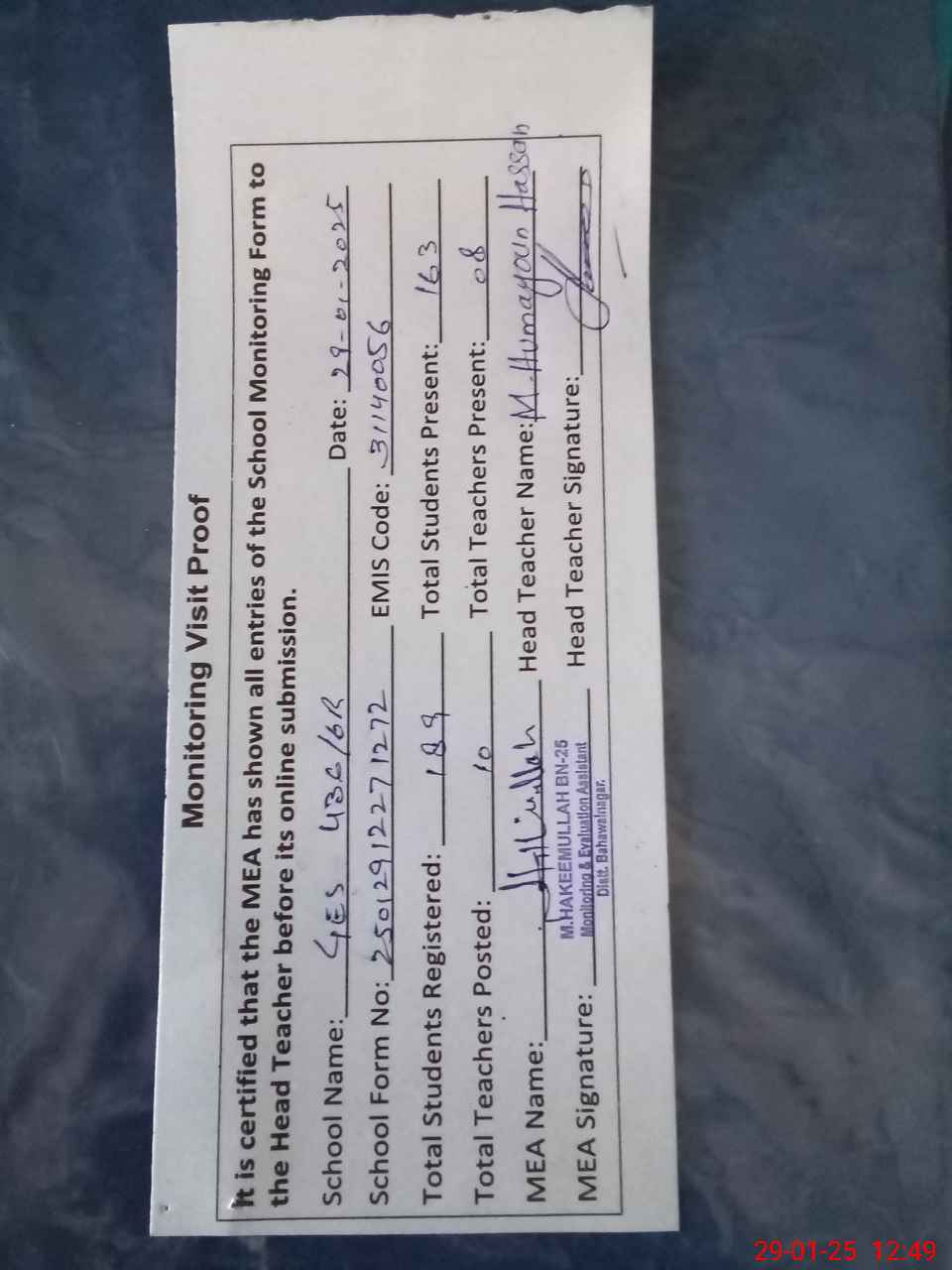 | Attendance Register | Head Teacher | MEA with School | Visit Proof |