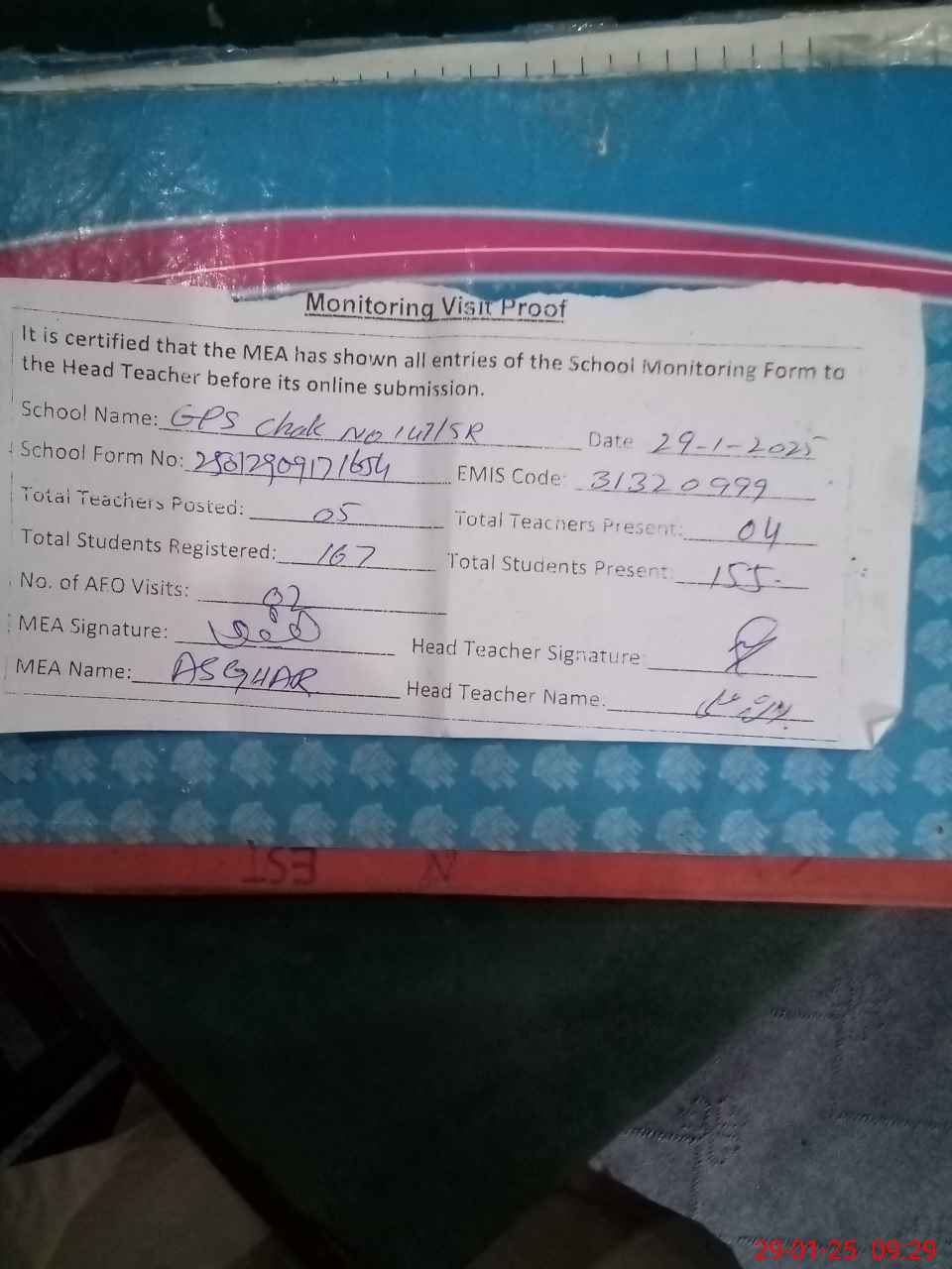 | Attendance Register | Head Teacher | MEA with School | Visit Proof |