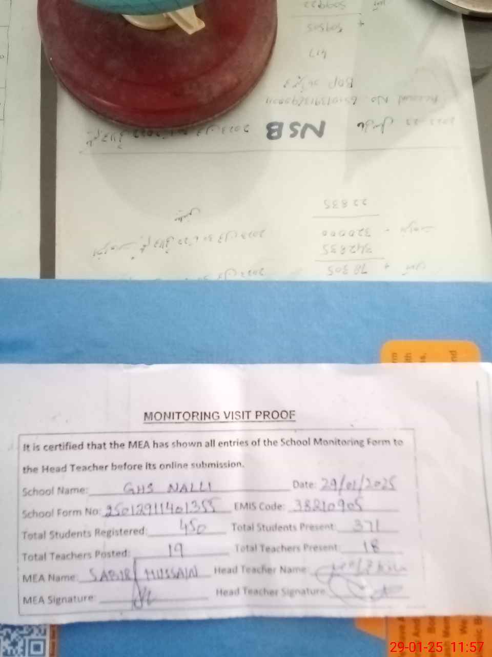 | Attendance Register | Head Teacher | MEA with School | Visit Proof |