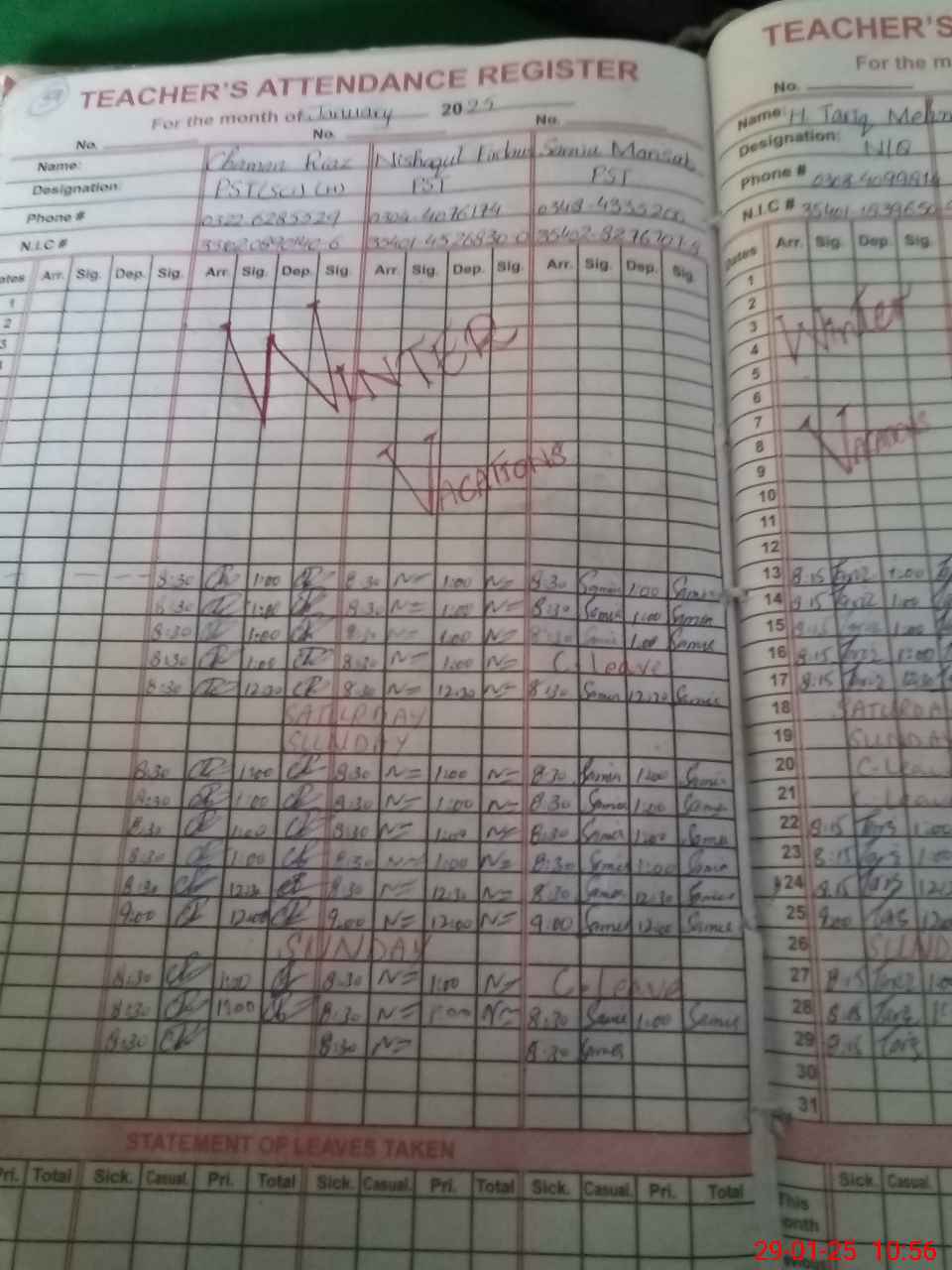 | CNIC | Full Name | Designation | R/C | Absence During Last Calender Month |